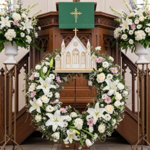 An altar-inspired wreath mirrors the flowers and colors used near the pulpit or communion table.