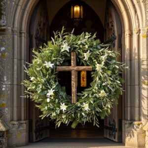 A cross and lily wreath is one of the most powerful Easter symbols for church décor.