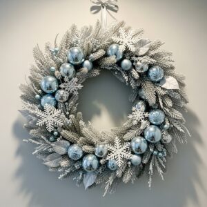Choose a wreath with icy blue ornaments, glitter snowflakes, and frosted greenery.