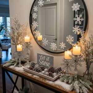 If your hallway has a console table, style it with snowflake décor pieces—snowflake candle holders, trays, runners, and ornaments.