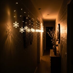 Use double-sided tape or removable adhesive for easy setup. This is an inexpensive yet stunning way to make your hallway feel like a snowy Christmas escape.