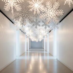 Decorate long walls with snowflake garlands that stretch across the hallway.