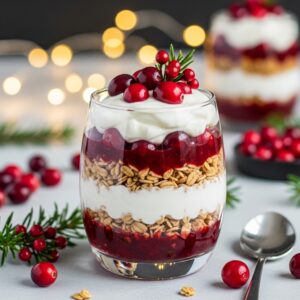 Layers of Greek yogurt, high-protein granola, and cranberry compote make a festive snack.