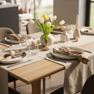 Choose table runners, placemats, or napkins in soft fabrics like linen or cotton with subtle patterns or textures.