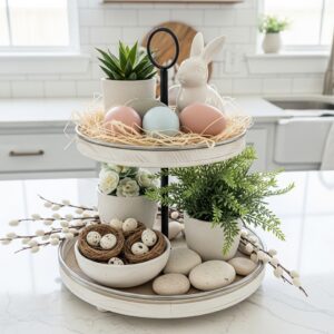 Mix everyday kitchen items like plates and bowls with seasonal decor such as small plants, bunny figurines, or pastel mugs.