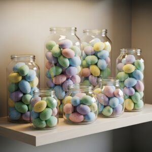 Fill clear glass jars with pastel or neutral-toned Easter eggs for a simple yet eye-catching display.