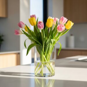 Choose a single type of flower—like tulips, daffodils, or lilies—and display them in a clear or ceramic vase.