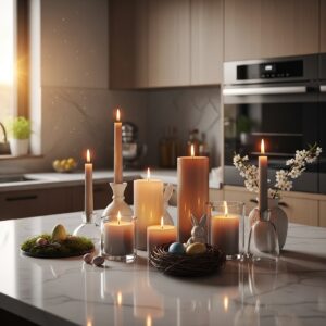 Choose neutral or pastel-colored candles and place them on your countertop or dining area.