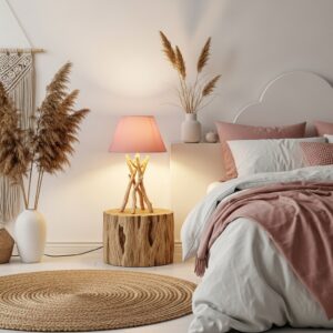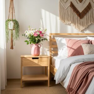 A wooden nightstand with a pink vase adds an earthy and soft feminine touch to the bedroom.