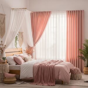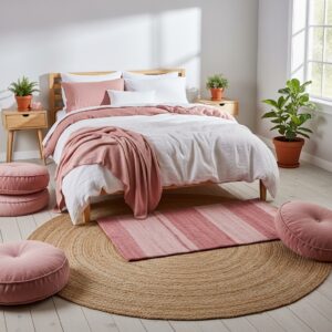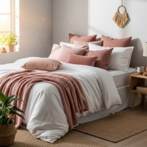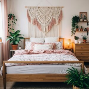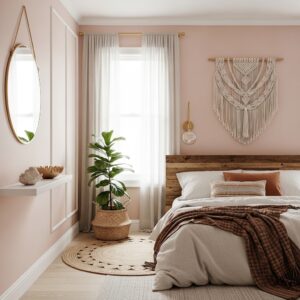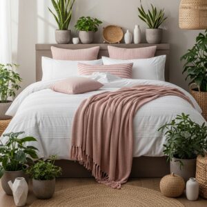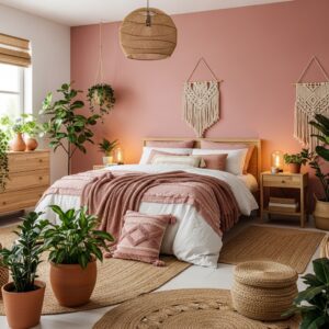 Creating a pink and white earthy bedroom combines soft, calming hues with natural textures and materials, producing a space that feels both cozy and refreshing.