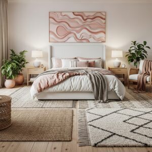 Combine earthy textures with subtle pink for a warm and grounded space.