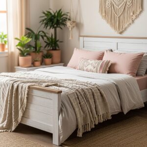Brighten your bed with white linen and soft pink accents for a cozy, earthy feel.