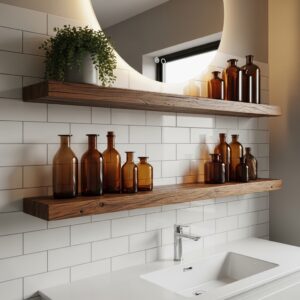 Floating reclaimed wood shelves or a teak shower mat add organic texture and visual interest.