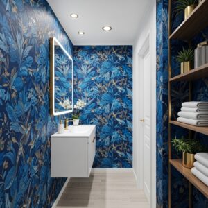 Adding a bold, patterned wallpaper to the “far” wall of a narrow bathroom creates a “feature wall” effect.