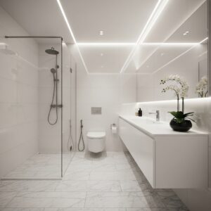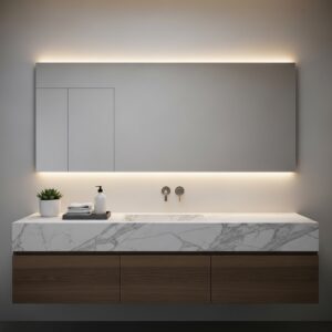 This “layered” lighting approach adds depth to the room, making it feel more like a luxury spa and less like a standard utility space.