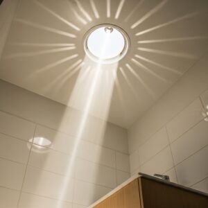 These “tubular skylights” funnel natural sunlight from the roof down into the bathroom.