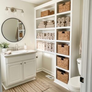 Use the lower shelves for daily essentials like towels and the higher, less accessible tiers for decorative baskets or long-term storage.