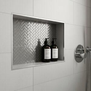 This provides a sleek, permanent home for shampoos and soaps, keeping the shower interior looking tidy and intentionally designed.