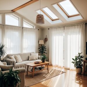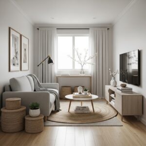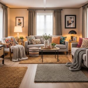Textiles like rugs, curtains, and throw pillows add warmth and personality.