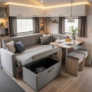 Large windows, skylights, or glass doors can transform a small mobile home interior.