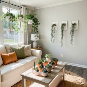 Use hanging planters or wall-mounted pots to add greenery without consuming valuable floor space.