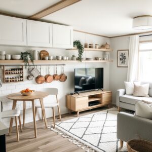 Walls are your best friends in a singlewide home. Install shelves, hooks, or floating cabinets to free up floor space.