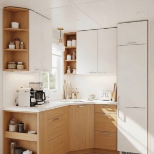 Pull-out pantries or corner shelves make use of tight spaces.