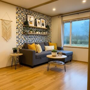 A statement wall in the living area can act as a focal point, giving personality to the interior without cluttering small spaces.