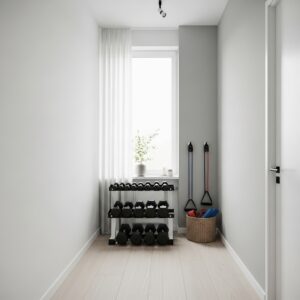 For example, a vertical dumbbell rack can store multiple weights in a compact footprint, leaving floor space free for bodyweight exercises or stretching.