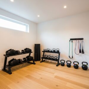 For instance, installing a pegboard on one wall can hold smaller items like jump ropes and gloves, while open shelves can neatly display weights and water bottles.
