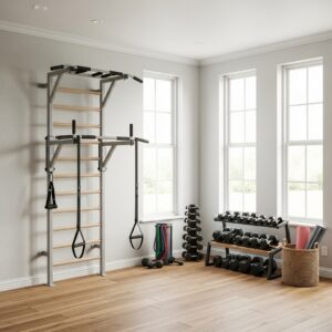 Wall bars or pull-up stations are perfect for small gyms because they occupy vertical space rather than the floor.