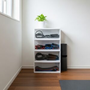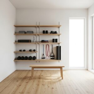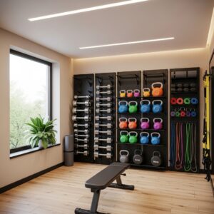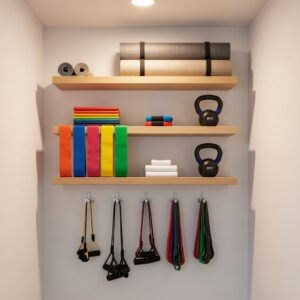 Shelves, hooks, and racks can store resistance bands, yoga mats, kettlebells, and medicine balls off the floor.