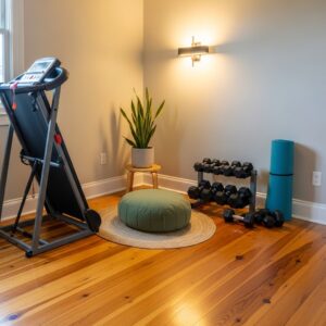 This area completes the home gym experience, encouraging mindfulness and recovery while fitting comfortably within a small room.
