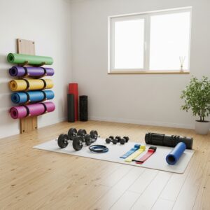 For example, a slim bench can double as seating and support for exercises, while small storage cubes can hold towels or resistance bands.