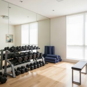 Simple benches, storage cabinets, and open shelves provide storage without taking up much space. Avoid bulky or decorative furniture that can reduce available workout areas.