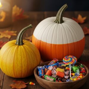 Paint your pumpkin in three bands of white, orange, and yellow to mimic the look of candy corn.