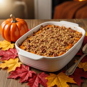 Mashed sweet potatoes baked with a crunchy buttery pecan topping.