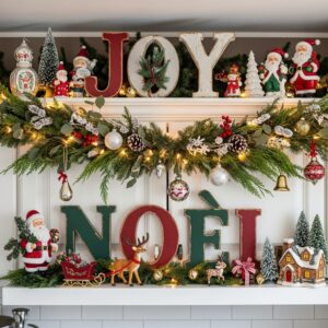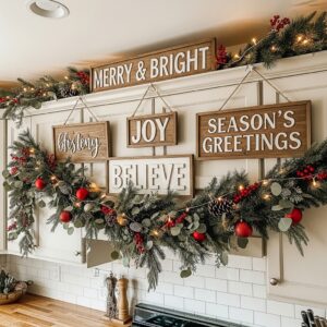 Add wooden or metal Christmas signs with phrases like “Merry & Bright” or “Joy to the World.”