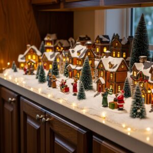 Create a small holiday village on the cabinet tops using miniature houses, figurines, and trees.