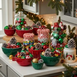 Fill them with ornaments, pinecones, or candy for a functional yet decorative touch.