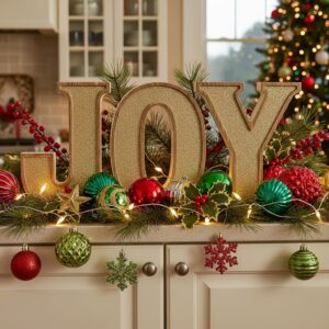 Place large letters spelling “JOY,” “NOEL,” or “MERRY” along the cabinet tops.