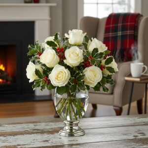 13. White Roses with Holly Accents