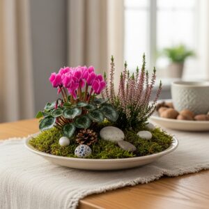 Plant miniature flowering plants like cyclamen or heather in a shallow bowl with moss and decorative stones. Create a tiny indoor winter garden.