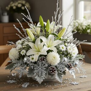 Create a serene winter look with white flowers like lilies, chrysanthemums, or hydrangeas.
