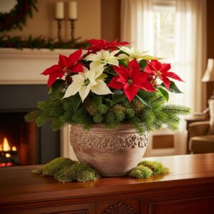 Arrange red or white poinsettias in a decorative pot with moss or evergreen clippings around the base.