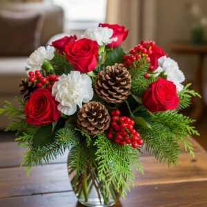 Combine red roses, white carnations, and sprigs of evergreen for a timeless winter look.