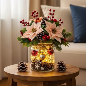 Mix poinsettias, pinecones, berries, and small seasonal ornaments in a glass jar. Ideal for kitchen counters or side tables.