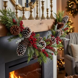 String pinecones with berries and small evergreen branches for a tabletop or mantel garland.