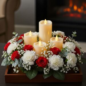 White carnations, red roses, and ivy look lovely around flameless LED candles.