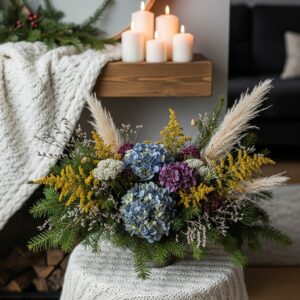 Combine evergreen branches with dried flowers like hydrangeas, statice, or grasses.